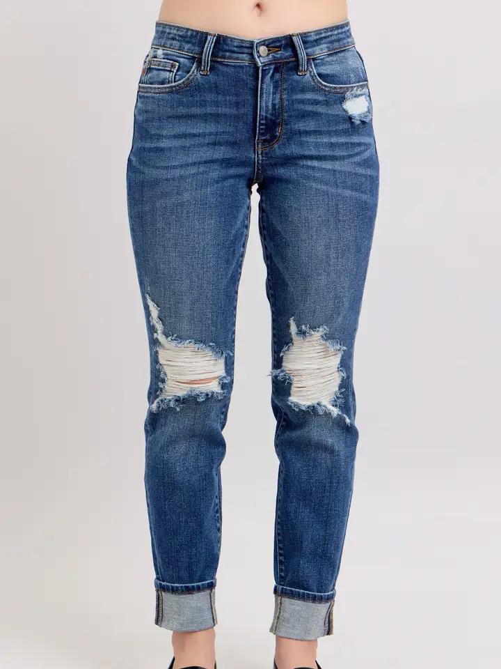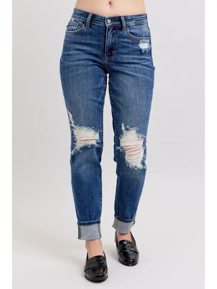 Distressed Mid-Rise Boyfriend Fit- Med Wash - by Judy Blue