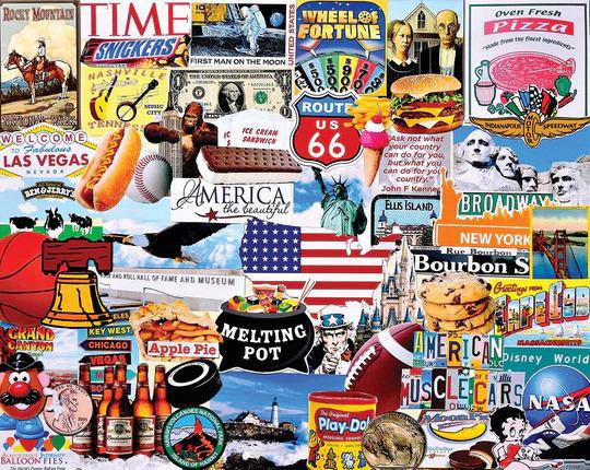 I Love America. Nothing says America like football, apple pie, Betty Boop & Budweiser. And, of course, the Statue of Liberty, the bald eagle, a buffalo nickel & Lincoln penny, Mt. Rushmore, the Liberty Bell, American Gothic, Uncle Sam, and a quote from our beloved JFK. Baseball and hot dogs, King Kong and the Empire State Building, Twinkies, pizza, chocolate chip cookies and Mr. Potato head are just a few of the many iconic images assembled on this 1,000 piece puzzle by Charlie Girard. Finished size 24" x 30".