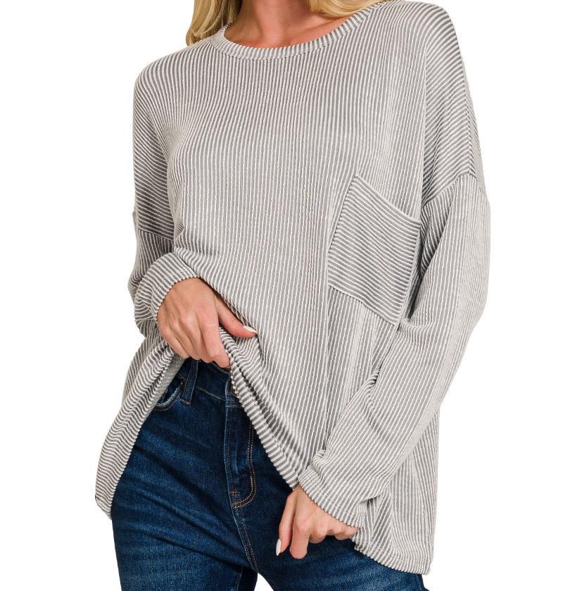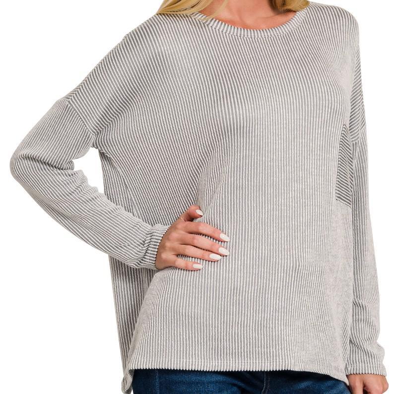 Ribbed Striped Oversized Long Sleeve Top - LT Gray - by Zenana