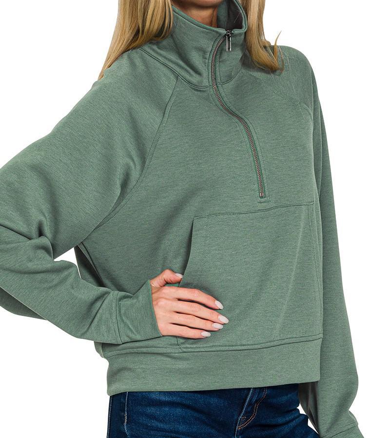 Scuba Half Zip Pullover with Kangaroo Pocket - Dark Forest - by Zenana