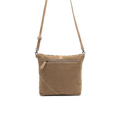 Beautiful form and great function meet in this eye-catching bag, which features a great blend of sandstone canvas, upcycled woven rug and soft light brown leather. Special brad accents, special stitching, a zipper-close top, and a zippered front pocket make for a fantastic bag you’re sure to love. Detachable matching leather strap is fully adjustable.